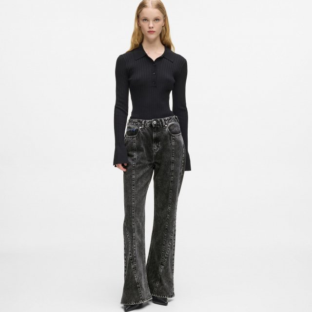 Step into a silhouette that speaks confidence. These Karl Lagerfeld Jeans are designed for women who want their denim to do more than just fit — they want it to flatter. Cut from premium washed black denim, this high-rise flared style hugs the waist and hips before flowing into a bold, elongating flare. Distinctive seam detailing shapes the body beautifully, giving the jeans a modern edge with a refined, fashion-forward feel.